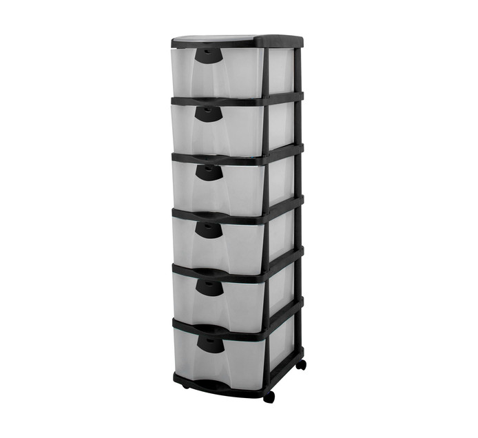 Built-in stops help ensure the drawers wont fall out. Homz Plastic 6 Clear Drawer Medium Home Storage Container Tower with 4 Large Drawers and 2 Small Drawers Black Frame. Each drawer has a 25-pound capacity and a drawer stop for additional security while the removable glide casters increase mobility and the interlocking system offers flexibility and stability.