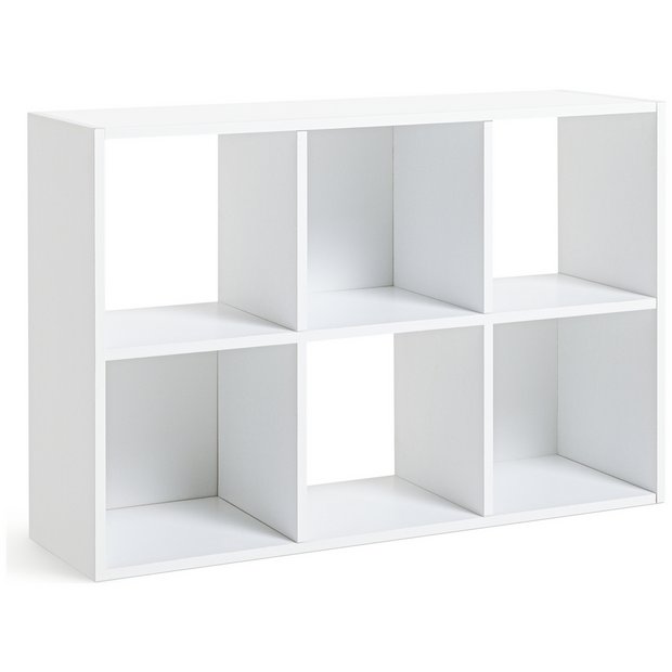 The white six-cube organizer has three open-back and three closed-back equally sized compartments. Features plenty of space to store books magazines ornaments and picture frames. Always a good deal.